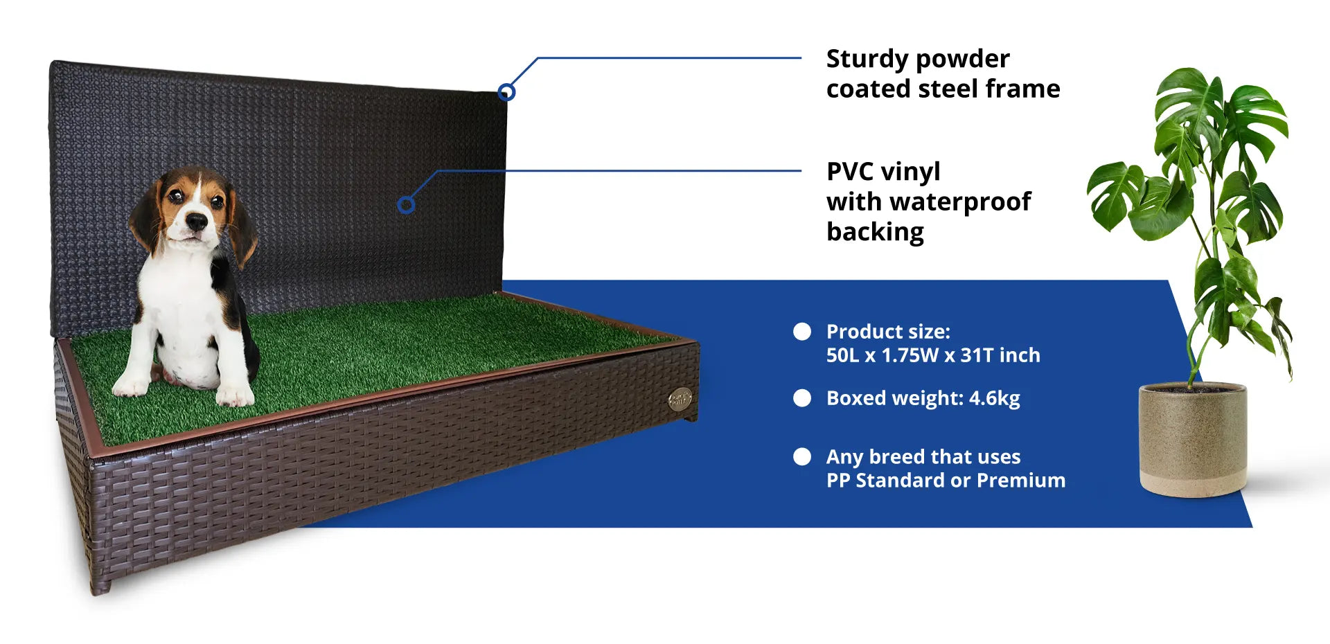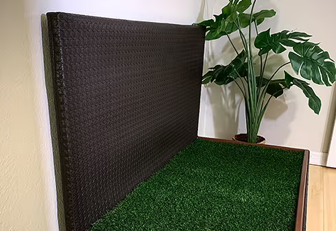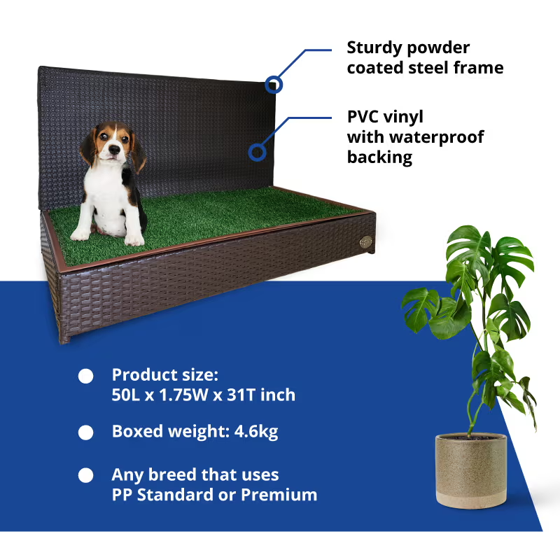 The Pee Pee Panel acts as a shield to protect furniture from pee splashes if your dog lifts its leg and the pee goes over the Porch Potty. The Pee Pee Panel is also beneficial for outdoor balconies to prevent pee from going through the gated balcony area. Or, the panel can be added if your dog needs more privacy while doing their business.