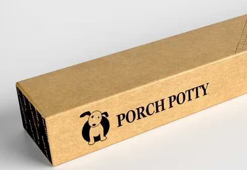 We ship the Pee Pee Panel in a recyclable Kraft shipping box with the text “Porch Potty” and our mascot, Spot, greeting you at your doorstep