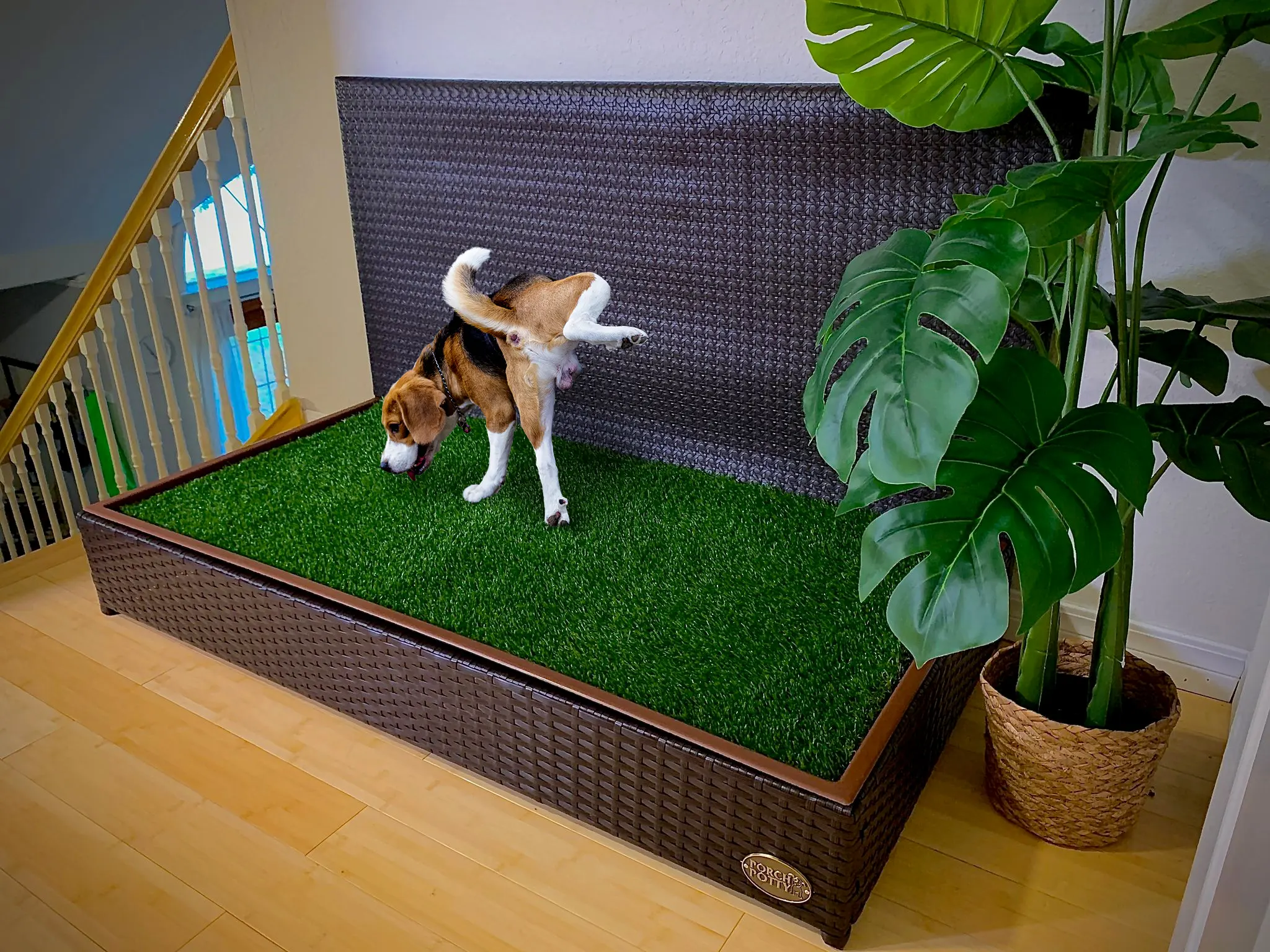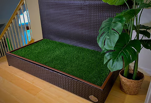 The Pee Pee Panel should preferably be placed against a wall or gate to avoid accidental tipping. Although this isn’t likely to happen under most circumstances, supervise your dog during its first use to ensure their weight doesn’t shift the Porch Potty or Pee Pee Panel.